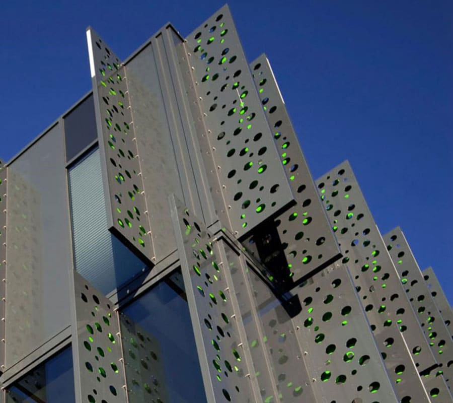 Netto Perforering fremstillede facadebeklædning til denne unikke bygning, i alt 2500 m2 perforerede plader, hvor ikke 2 plader er ens.